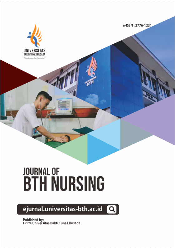 Journal of BTH Nursing is a scientific journal published by LPPM STIKes BTH Tasikmalaya. The focus and scopes of Journal of BTH Nursing include adult nursing, emergency nursing, gerontological nursing, community nursing, mental health nursing, pediatric nursing, maternity nursing, nursing leadership and management, complementary and alternative medicine (CAM) in nursing, and education in nursing. The journal is registered with e-ISSN : 2776-1231.